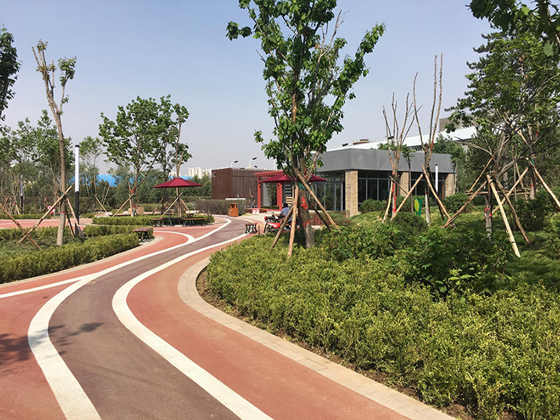 园建工程:石材铺装、彩色透水混凝土铺设已全部完成;坐凳、垃圾桶、指示标志已安装完成。