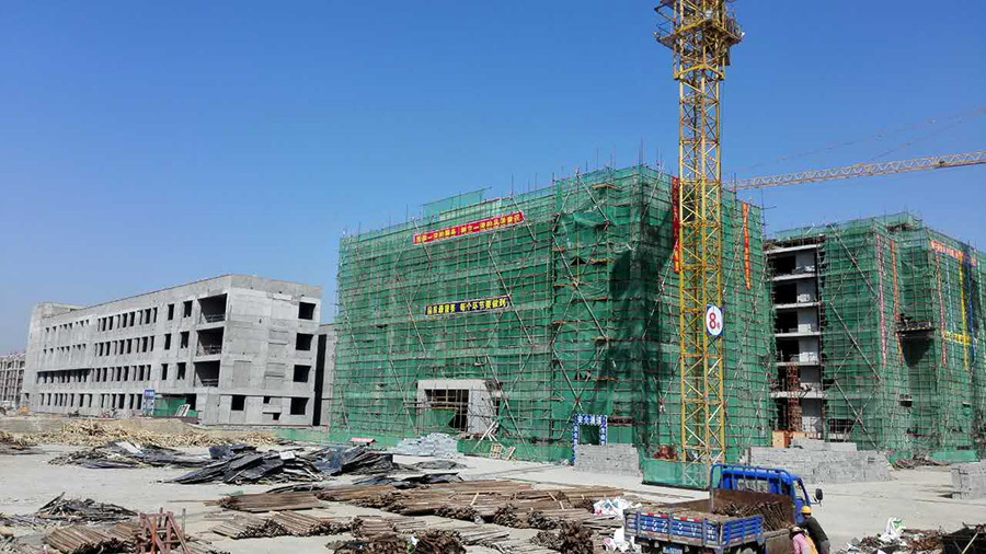 中学教学楼:1段至3段主体结构及砌体工程已完工;1段、2段外墙抹灰已完成,正在进行内墙抹灰;3段正在做外墙抹灰和屋顶防水。