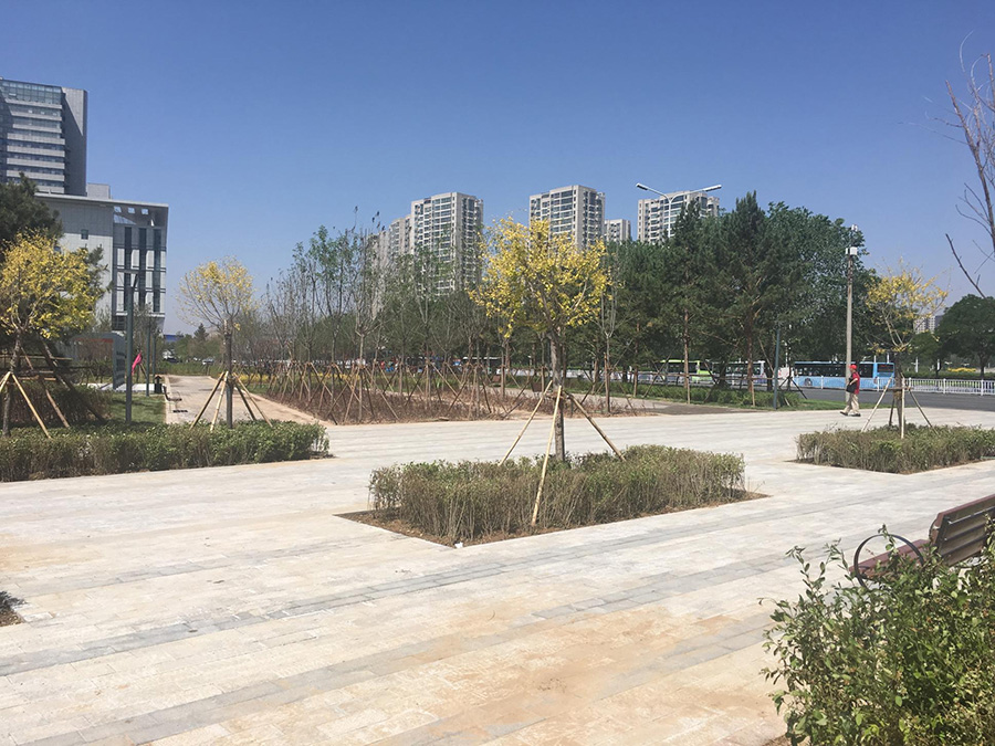 园建工程:铺装、廊架、景墙已全部完成,建行南侧彩色透水混凝土正在上色工作;石材坐凳、普通坐凳安装完成,特色坐凳安装中。