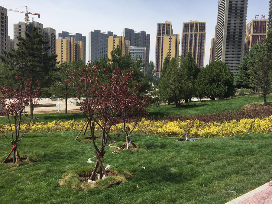 绿化已完成90%;景观管道土方、铺装土方已全部完成;景观给排水外线、景观电气工程、铺装工程完成80%;东侧青城驿站砌筑、内墙抹灰、屋面找坡、保温及找平层已完成;西侧青城驿站砌筑、内墙抹灰、屋面保温、地面垫层、保温已完成。廊架一、连廊、单臂花架、景观三角亭主体、景观廊架四基础、方钢廊架已完成。