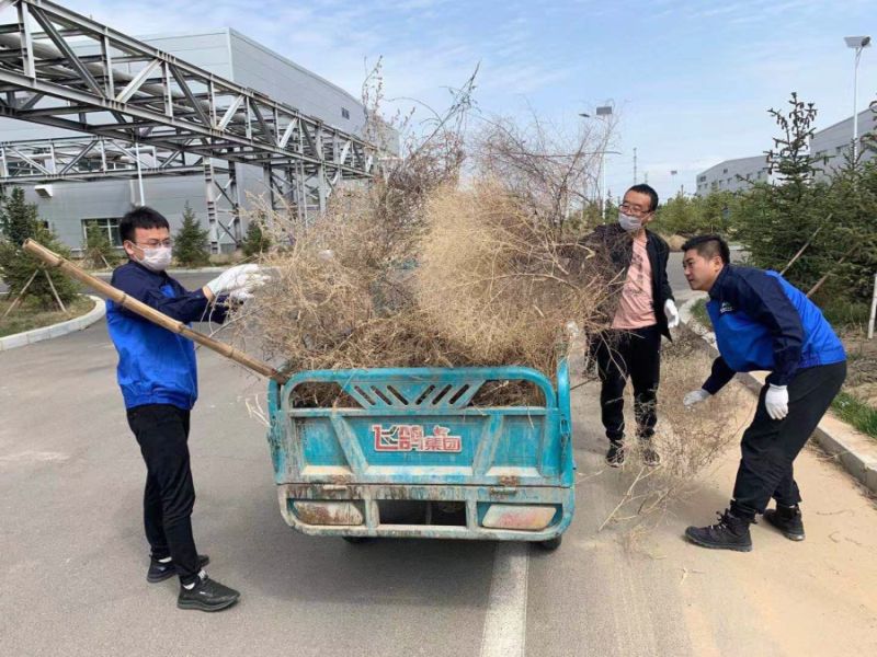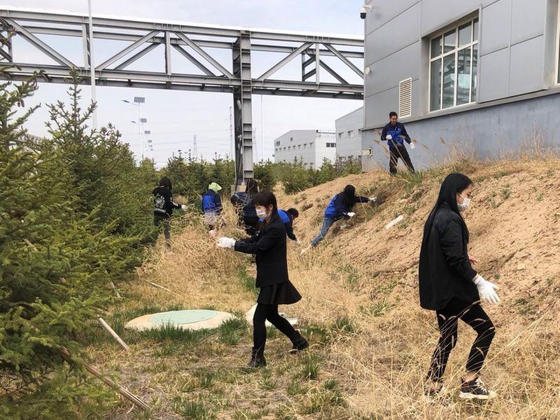 图为爱迩员工对特气房周围未硬化绿化区域的风滚草进行捡拾清理
