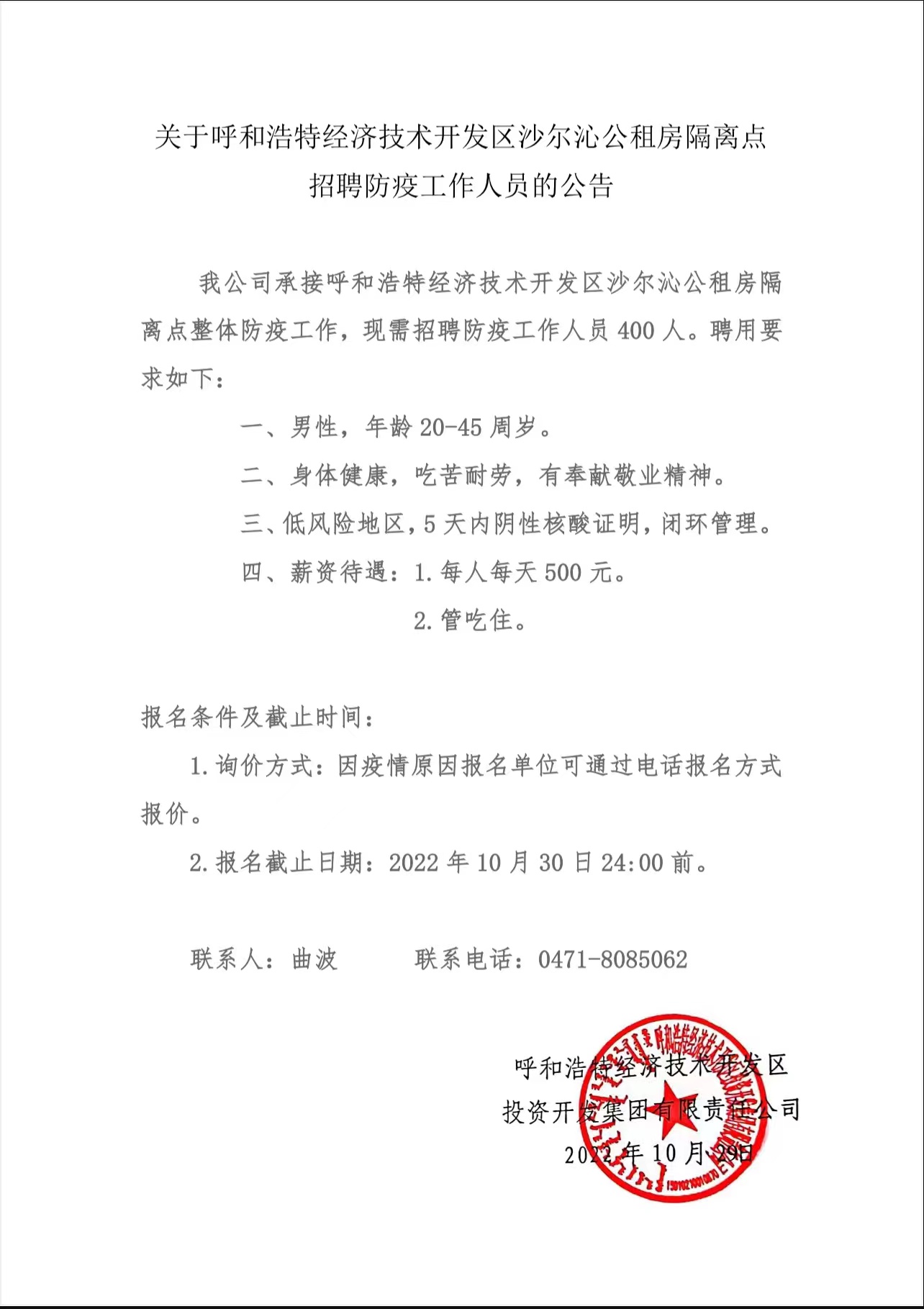 我公司承接呼和浩特经济技术开发区沙尔沁公租房隔离点整体防疫工作,现需招聘防疫工作人员400人。聘用要求如下: