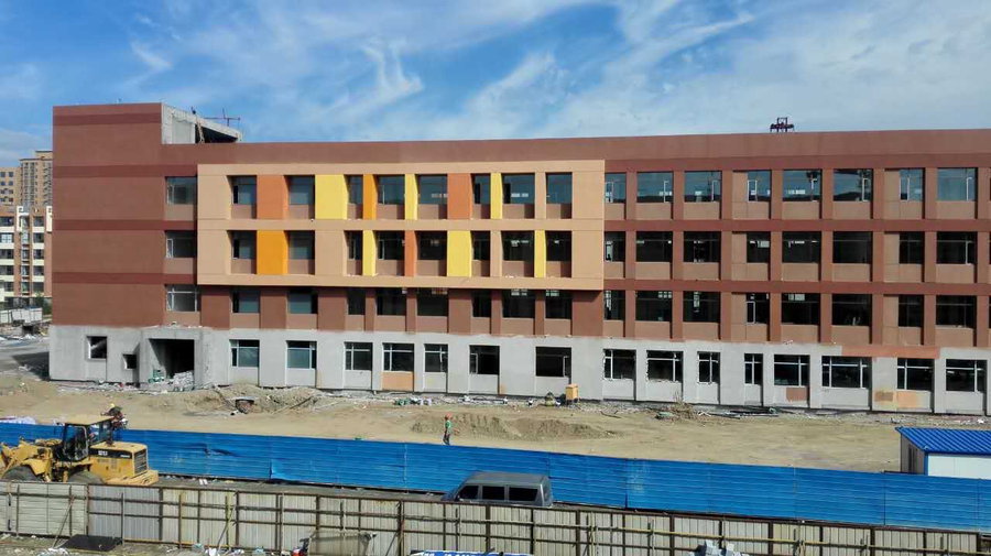 截止到2017年7月24日,小学教学楼室内和走廊已完成铺砖,窗户、玻璃、暖气片和走廊灯已完成安装,桥架、穿线、外墙保温已完成,现正在进行木地板、窗台板的安装及真石漆的涂抹;中学教学楼室内和走廊已完成铺砖,桥架、室内外穿线、室内吊顶、外墙保温已全部完成,现正在安装木地板、室内门、走廊吊顶和走廊灯;地库防水腻子全部完成,现正在进行排风管道的安装和地面面层混泥土的铺设;G1号楼的室内外抹灰全部完成,现正在进行采暖立管、排水管道和电梯的安装;G2号楼的室内垫层浇筑、外墙抹灰、卫生间防水已完成,窗框、采暖立管、排水管道的安装已完成,现正在进行电工穿线和电梯的安装;G3号楼的一层二次结构已完成,屋面保温也已完成;G4号楼的一层二次结构尚未完工,现正在进行中;看台的室内外抹灰、室内垫层浇筑已完成,防水也全部完成。